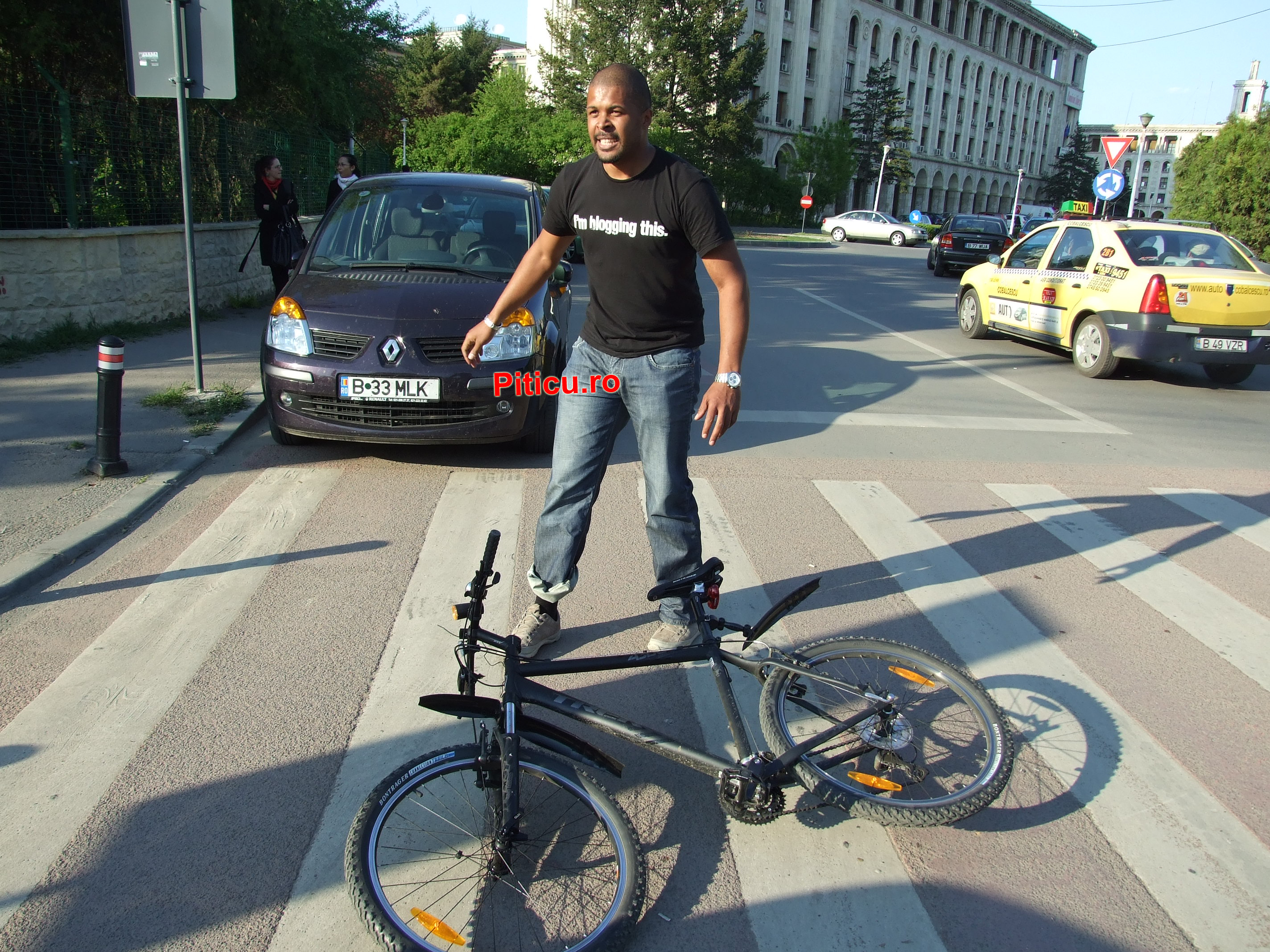 Si individul ala vine … da cu bicicleta in portiera, dupa care o tranteste pe jos si incepe sa strige ca din gura de sharpe ca cine stie ce am facut eu si cine stie nu stiu cum. Ies din masina … vad ca e Cabral, ma apuc sa vorbesc cu el, sa-l calmez, il intreb daca a patit ceva. El nu si nu. Vad ca nu ma inteleg cu el, trag masina pe dreapta, pun avariile, scot camera si ii fac doua poze ca sa am sa nu care cumva sa vina si sa zica ca l`am umplut de sange.
